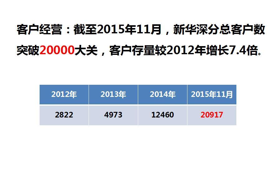 客戶經(jīng)營(yíng):截至2015年11月,新華深分總客戶數(shù)突破20000大關(guān),較2012年增長(zhǎng)近7.4倍。