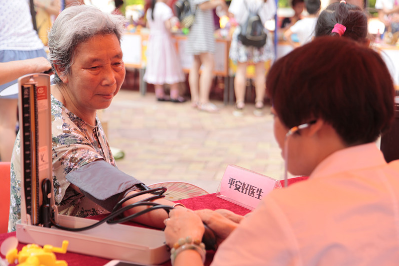 義診現(xiàn)場(chǎng),居民們排隊(duì)等候醫(yī)護(hù)人員幫他們做檢查?!扒皟商欤吹胶?bào)上說今天的活動(dòng)有義診,這不,剛帶孫子游泳回來就過來了。”居民劉奶奶從包里拿出了一個(gè)裝藥品的塑料袋,告訴記者,自己高血壓,想讓醫(yī)生瞧瞧那些藥還要不要吃。