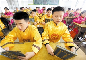 “父母呼,應(yīng)勿緩,父母命,行勿懶……”新學(xué)期開學(xué)后,每天上午上課前十分鐘,寶龍學(xué)校2000多名學(xué)生,都會(huì)拿出學(xué)校特制的講義,齊聲誦讀《弟子規(guī)》。這是該校為培養(yǎng)學(xué)生養(yǎng)成良好的行為習(xí)慣、弘揚(yáng)祖國(guó)優(yōu)秀傳統(tǒng)文化而推出的“國(guó)學(xué)經(jīng)典進(jìn)課堂”計(jì)劃的一部分。