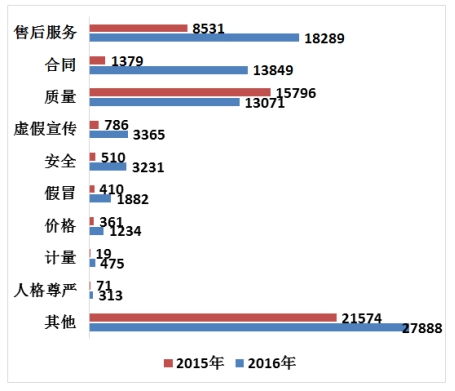 由于投訴總量的激增,相對于2015年,除質量問題之外,其他各類的投訴問題都增加,增加的幅度大多超過了1倍。如表3,圖4所示。