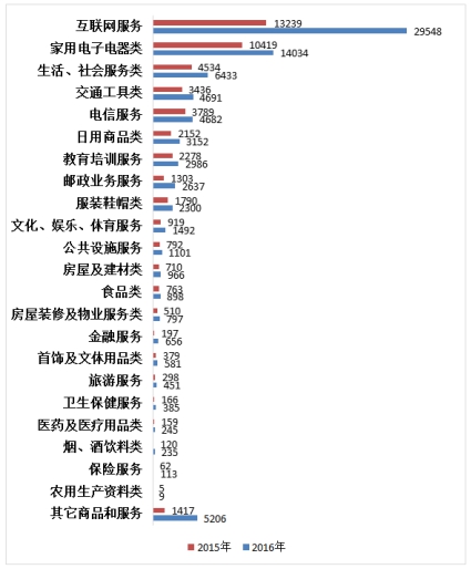 2016年商品和服務二十三大類投訴,相對2015年數量均有所增長?;ヂ?lián)網服務、家用電子電器類、生活社會服務類、交通工具、電信服務類五大類投訴量居前,分別占投訴總量的35.35%、16.79%、7.70%、5.61%和5.60%。
