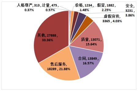 從投訴性質看,2016年受理的投訴中,反映最突出的是售后服務問題,18289宗,占21.88%;其次是合同問題,13849宗,占16.57%;再就是質量問題,13071宗,占15.64%;三大性質類別的投訴比率都超過了10%。虛假宣傳問題、安全以及假冒問題,分別有3365宗、3231宗和1882宗,所占比率都低于5%。如圖3所示。