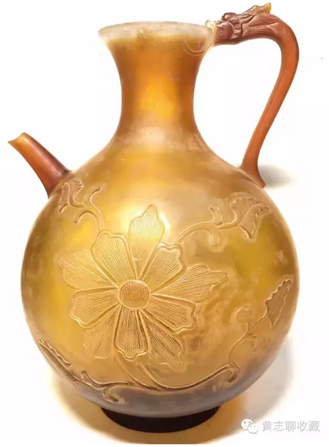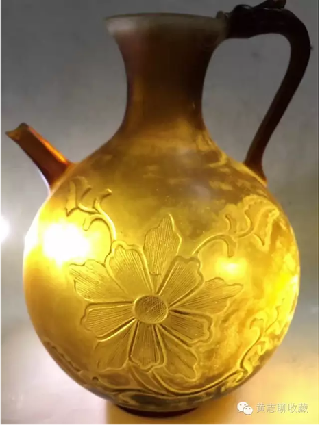 琉璃在唐代極為名貴。這從史書記載可窺一二。房玄齡的《晉書》中有關(guān)于琉璃器的記載“(王濟(jì))性豪侈,麗服玉食……帝嘗幸其宅,供饌甚豐,悉貯琉璃器中?!蓖鯘?jì)在招待皇帝時用了成套的琉璃碗盤,以逞其豪富,可見當(dāng)時琉璃器之貴重或要超過金、銀等器。又如宋代司馬光主編的《資治通鑒》中記載了這樣一段歷史事實:嶺南節(jié)度使路嗣恭在平息叛亂中趁機劫掠商民,得到了大批財物。他把其中一個直徑九寸的琉璃盤獻(xiàn)給了唐代宗。唐代宗非常高興,“以為至寶”。法門寺地宮出土的唐代琉璃器大多為皇家捐贈的禮佛之物也可佐證其珍貴。 這件執(zhí)壺為琉璃材質(zhì),高20cm、腹徑14.5cm,色澤黃褐,半透明,晶瑩潤澤,光澤柔和。小口,束頸,腹部圓鼓,餅足;前有直流,后為龍柄。整體形制穩(wěn)重大方,圓潤飽滿,具有典型的唐代特征。壺身兩面刻有菊紋,線條流暢自然,勁健有力。整體透入出唐人的灑脫自信。這類唐代的琉璃作品存世極少,目前為數(shù)不多的一些作品大多出自窖藏、地宮及貴族墓葬,屬于珍稀文物。此件執(zhí)壺保存完整,尤為難得。 欣賞更多藏品,歡迎瀏覽【黃志博物館】網(wǎng)站:www.huangzhimuseum.com?