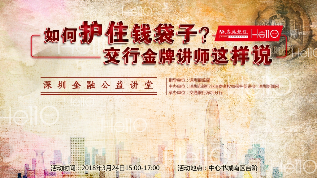 在深圳銀監(jiān)局指導(dǎo)下,由深圳新聞網(wǎng)和深圳市銀行業(yè)消費(fèi)者權(quán)益保護(hù)促進(jìn)會(huì)共同主辦,交通銀行深圳分行承辦的2018年“深圳金融公益講座”系列活動(dòng)將在3月24日14:30,于中心書城南區(qū)大臺階拉開帷幕。