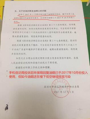 據(jù)悉,該市民在2017年已在信訪局上針對低層油煙管道對居民區(qū)排放油煙的問題進行投訴,當年12月1日得到了深圳市羅湖區(qū)環(huán)境保護與水務(wù)局的回復(fù),稱羅湖區(qū)環(huán)水局已于2017年1月對相關(guān)低空排放油煙的餐廳提出了要將油煙高空排放的要求,餐廳安裝的高空煙管也已于2017年10月正式投入使用。