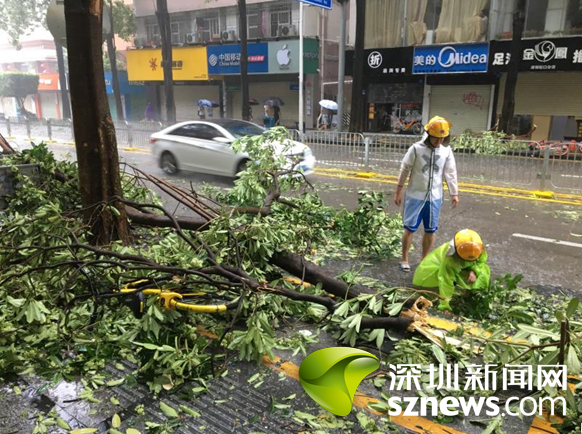 9月16日上午,蛇口街道南水社區(qū)黨委書記、婦聯(lián)主席李淑文,冒著可能被樹倒塌木砸傷的危險,浸泡在沒膝的雨水中幾個小時清理臺風刮落路面的樹枝,讓來往車輛順利通行。