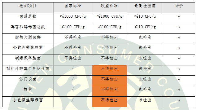 歐盟對(duì)化妝品中微生物要求更加嚴(yán)格,國(guó)標(biāo)要求5項(xiàng),歐標(biāo)要求9項(xiàng)。檢測(cè)結(jié)果顯示:8款氣墊粉底微生物檢測(cè)結(jié)果不僅符合國(guó)家標(biāo)準(zhǔn)要求,而且符合歐盟法規(guī)要求。