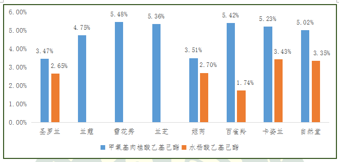 圖3.8款產(chǎn)品化學(xué)防曬劑檢出情況