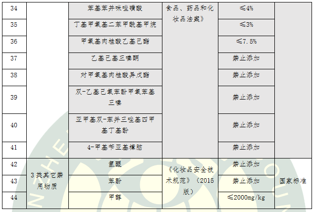 表4.15類化學(xué)防曬劑標(biāo)準(zhǔn)要求比對(duì)及評(píng)價(jià)結(jié)果