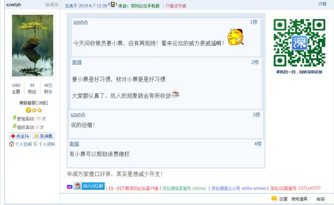 近來,有市民以《華潤萬家蓮塘店耍賴不給購物小票!》為題在深圳論壇發(fā)帖稱,最近一段時間,華潤萬家蓮塘店拒絕提供購物小票,一開始是詢問收銀員后才給,后來干脆不給了,要求客戶自己用手機查看電子小票。發(fā)帖市民表示,根據(jù)自己購物習(xí)慣,付款離開收銀臺之前要通過購物小票核對貨款是否相符,否則可能會遇到“標(biāo)錯價或者優(yōu)惠打折時間已過,價格標(biāo)簽沒有及時更換,造成顧客多付款華潤萬家亂收錢的事情發(fā)生”。