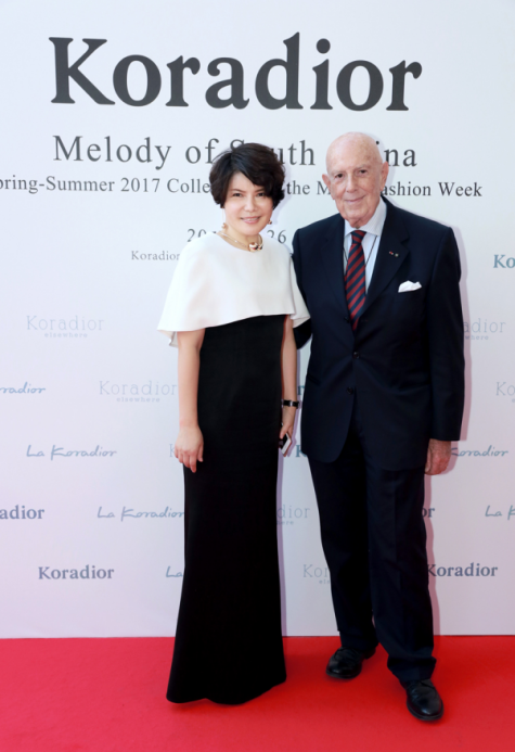 現(xiàn)任贏家時(shí)尚控股有限公司董事局主席金明先生和米蘭達(dá)可兒在2017年米蘭時(shí)裝周Koradior發(fā)布秀背景板合影