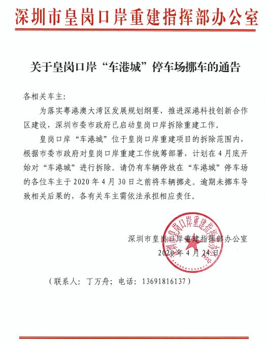 據(jù)了解,皇崗口岸“車港城”位于皇崗口岸重建項(xiàng)目的拆除范圍內(nèi),根據(jù)市委市政府對(duì)皇崗口岸重建工作統(tǒng)籌部署,計(jì)劃在4月底開(kāi)始對(duì)“車港城”進(jìn)行拆除。請(qǐng)仍有車輛停放在“車港城”停車場(chǎng)的各位車主于2020年4月30日之前將車輛挪走,逾期未挪車導(dǎo)致相關(guān)后果的,各有關(guān)車主需依法承擔(dān)相應(yīng)責(zé)任。