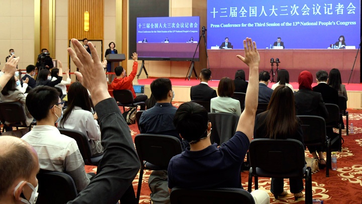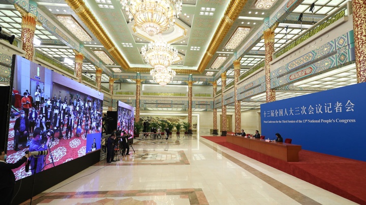 2020年5月28日(星期四)下午十三屆全國(guó)人大三次會(huì)議閉幕后,國(guó)務(wù)院總理李克強(qiáng)在人民大會(huì)堂三樓金色大廳出席記者會(huì)并回答中外記者提問(wèn)。為有效防控疫情,共同維護(hù)公共衛(wèi)生與健康,記者會(huì)采用網(wǎng)絡(luò)視頻形式進(jìn)行。新華網(wǎng)、中國(guó)政府網(wǎng)進(jìn)行現(xiàn)場(chǎng)直播。 [2020-05-2814:00 ]