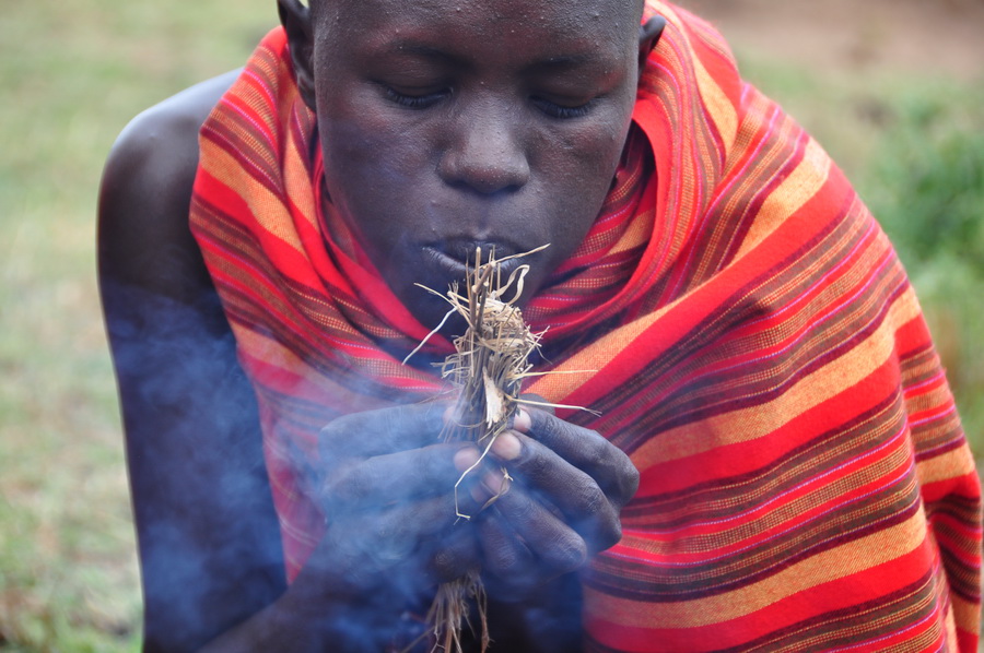 馬賽人盛行一夫多妻制。成年男子蓄發(fā)編成小辮,年輕婦女剃光頭。近年來(lái),定居的馬賽兒童開(kāi)始上學(xué),已出現(xiàn)少數(shù)馬賽人知識(shí)分子。圖為為游客表演鉆木取火等節(jié)目的馬賽人。李仁奇 攝
