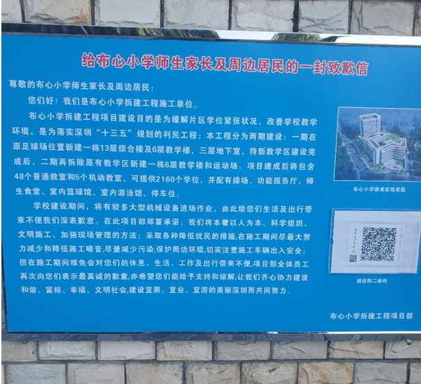 11月9日,有市民在深圳論壇發(fā)帖反映稱,“小孩如今就讀布心小學(xué)??砷_學(xué)一個(gè)月后,就看到校內(nèi)有公示說學(xué)校將會原地重建。”該家長對學(xué)生的安全情況表示擔(dān)憂:“這幾年因地下結(jié)構(gòu)受影響而導(dǎo)致路面坍塌的情況時(shí)有發(fā)生,現(xiàn)如今要在與教室目測距離不超過五米的地方建兩座分別為13層和6層的建筑,這樣大的工程量如果不分流,施工風(fēng)險(xiǎn)可想而知。即使重建采用高新技術(shù),能夠保證教室的安全,但學(xué)生又如何能在學(xué)校與工地的混合期里度過至少四年以上的工期?粉塵和噪音對學(xué)生的影響也很大也可想而知。”