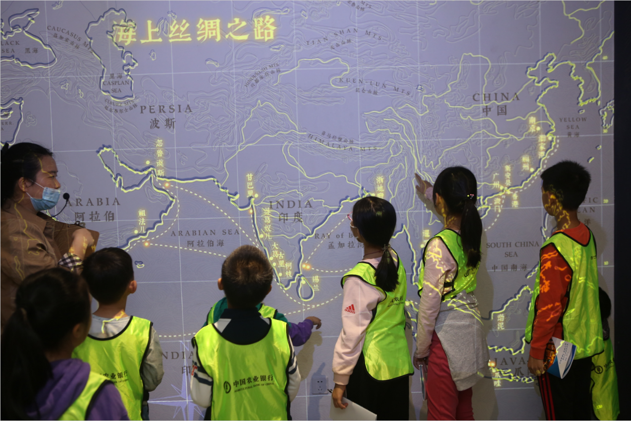 新安縣衙、東莞會館、報德祠、織金廣彩館、牌匾故事館、南頭古城博物館獻禮特區(qū)40周年展……小朋友們跟隨老師的步伐,認真聆聽著古城歷史。南頭1820數(shù)字展廳的絹本國畫長卷《南頭繁會盛景圖》吸引著孩子們的注意,這幅別具特色的畫卷采用三維鏡頭呈現(xiàn)出一幅具有中國畫意境、專屬南頭的古代勝景。孩子們通過沉浸式體驗,穿越回清朝的南頭古城,感受著古時候南頭人民的生活?!霸瓉砟项^古城這么厲害,以前各國到廣州貿(mào)易的商船都要先??吭谶@里,‘粵東首府、港澳源頭’指的都是南頭古城?!笔畾q的赫赫興奮的告訴記者。作為深圳、香港城市發(fā)展的共同源頭,南頭古城的發(fā)展史在很大程度上就是一部深圳城市的發(fā)展史。