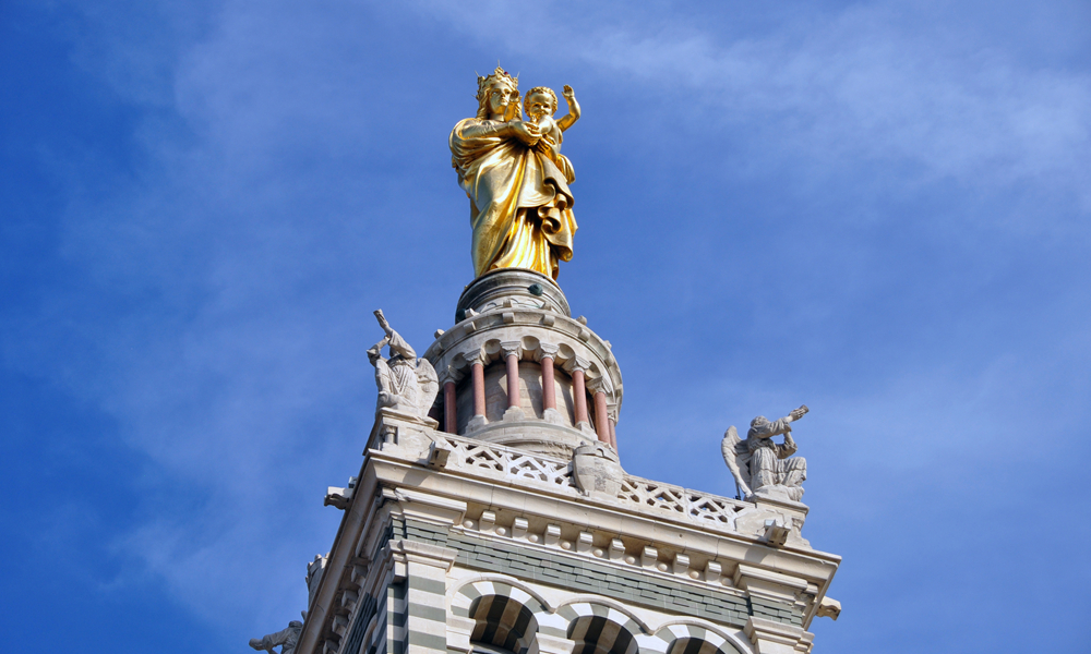 教堂主體建筑上方有一座金色的高達(dá)9.7米的鍍金圣母像,據(jù)說(shuō),幾乎在馬賽的任何角度都可看到這尊閃閃發(fā)光的圣母像,教堂也因此成為馬賽的標(biāo)志。李仁奇 攝
