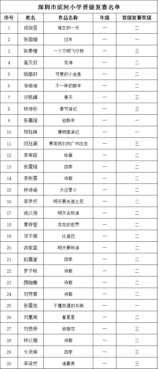 自2021年1月,活動征稿啟動以來,獲得了深圳市廣大中小學生、教師、文學愛好者的熱烈響應積極參與,吸引了深圳百余所學校的上萬人關注報名?,F(xiàn)公布深圳市濱河小學校園專場晉級復賽名單如下: