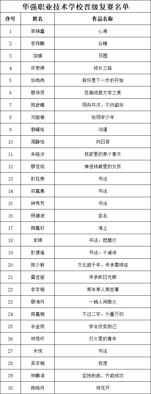 自2021年1月,活動(dòng)征稿啟動(dòng)以來,獲得了深圳市廣大中小學(xué)生、教師、文學(xué)愛好者的熱烈響應(yīng)積極參與,吸引了深圳百余所學(xué)校的上萬人關(guān)注報(bào)名。現(xiàn)公布福田區(qū)華強(qiáng)職業(yè)技術(shù)學(xué)校專場(chǎng)晉級(jí)復(fù)賽名單如下: