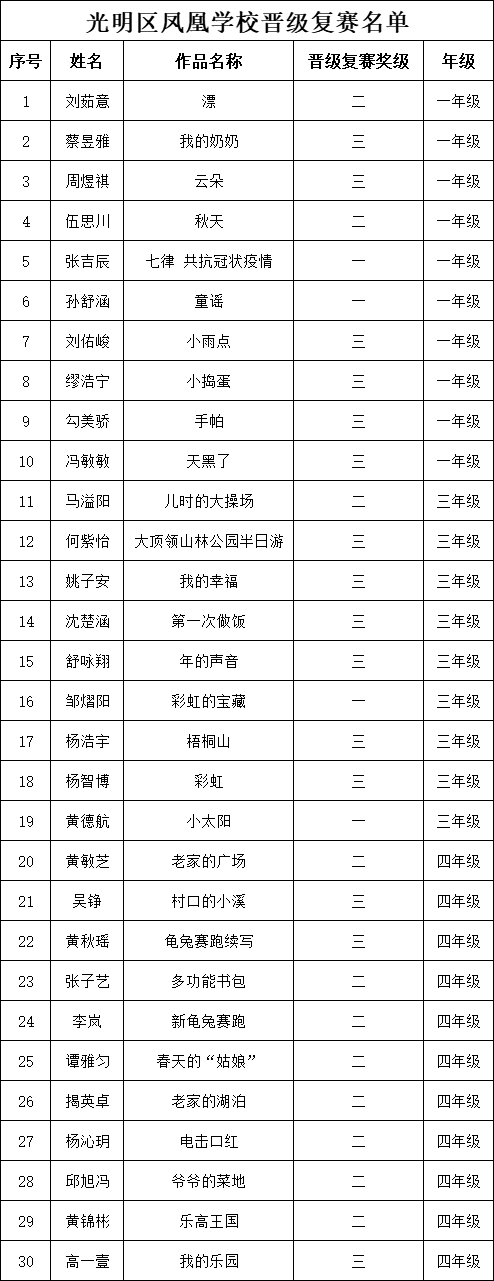 自2021年1月,活動(dòng)征稿啟動(dòng)以來(lái),獲得了深圳市廣大中小學(xué)生、教師、文學(xué)愛(ài)好者的熱烈響應(yīng)積極參與,吸引了深圳百余所學(xué)校的上萬(wàn)人關(guān)注報(bào)名?,F(xiàn)公布深圳市光明區(qū)鳳凰學(xué)校專場(chǎng)晉級(jí)復(fù)賽名單如下: