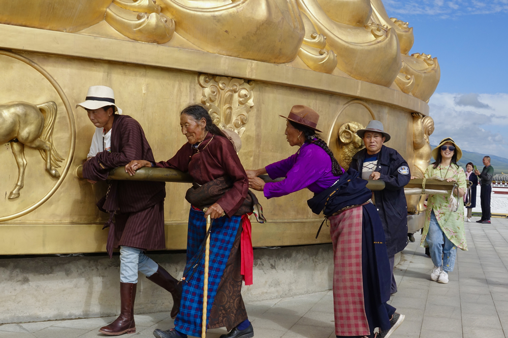 據(jù)傳,轉(zhuǎn)動(dòng)經(jīng)輪一周,即等同于念誦《大藏經(jīng)》一遍。藏傳佛教認(rèn)為,“持頌真言越多,越表明對佛的虔誠,可得脫輪回之苦”。李仁奇 攝