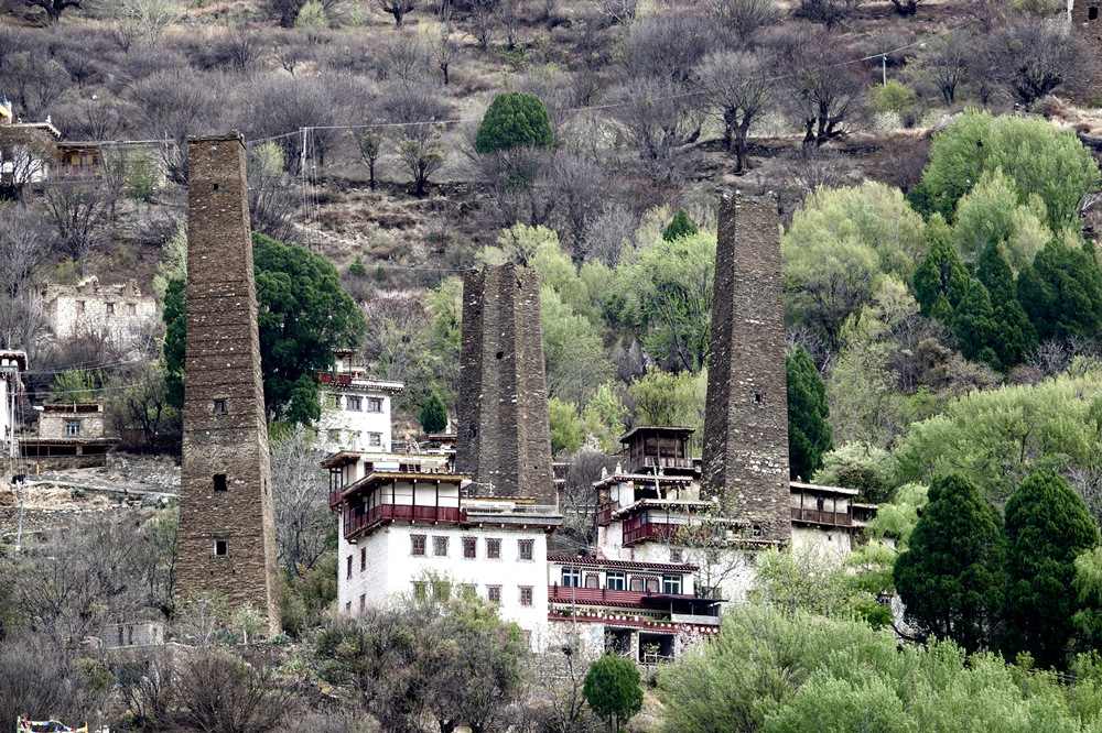 古碉為片石或石塊夾泥砌成,棱角筆直,墻面光滑,下寬上窄,一般高20余米,最高達(dá)50米,內(nèi)建樓層十余層至二十余層,每層可容納10余人。李仁奇 攝