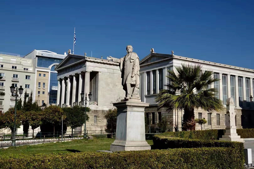 雅典在希臘獨立之后建了許多優(yōu)雅的新古典主義建筑,其中最著名的國家圖書館、國家科學院和雅典大學被稱為新古典主義三部曲,這三座建筑連在一起,蔚為壯觀,是這座城市的地標。李仁奇 攝