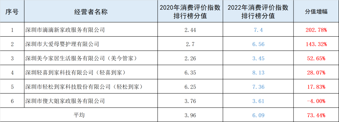 通過(guò)與2020年6月公布的深圳市家政行業(yè)消費(fèi)評(píng)價(jià)指數(shù)排行榜結(jié)果對(duì)比,共有6家經(jīng)營(yíng)者再次上榜,指數(shù)分值平均增長(zhǎng)2.13分,平均增幅73.44%。其中5家經(jīng)營(yíng)者消費(fèi)評(píng)價(jià)指數(shù)得分均有上升。
