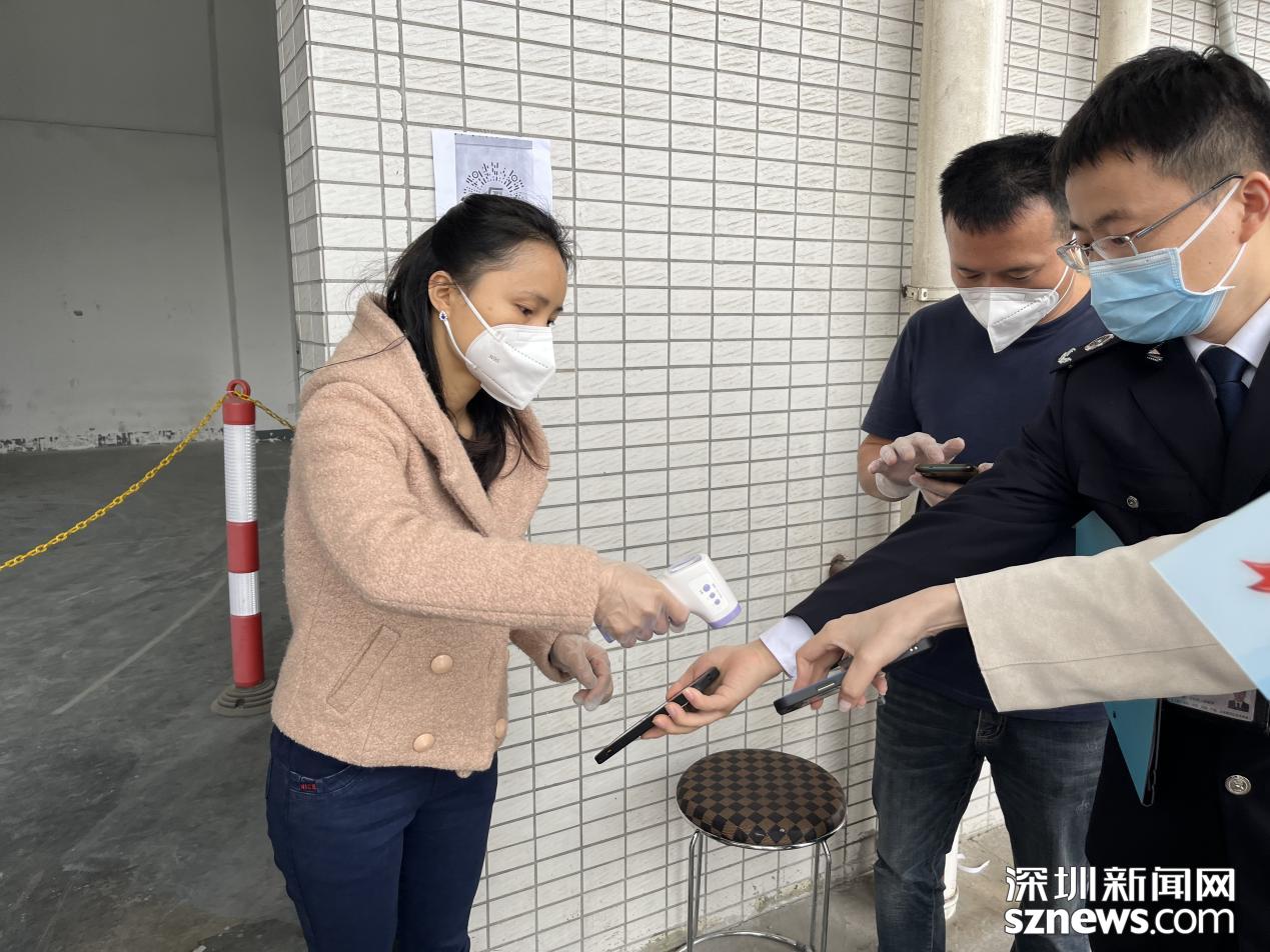 執(zhí)法人員一行正在入口處掃碼測溫。
