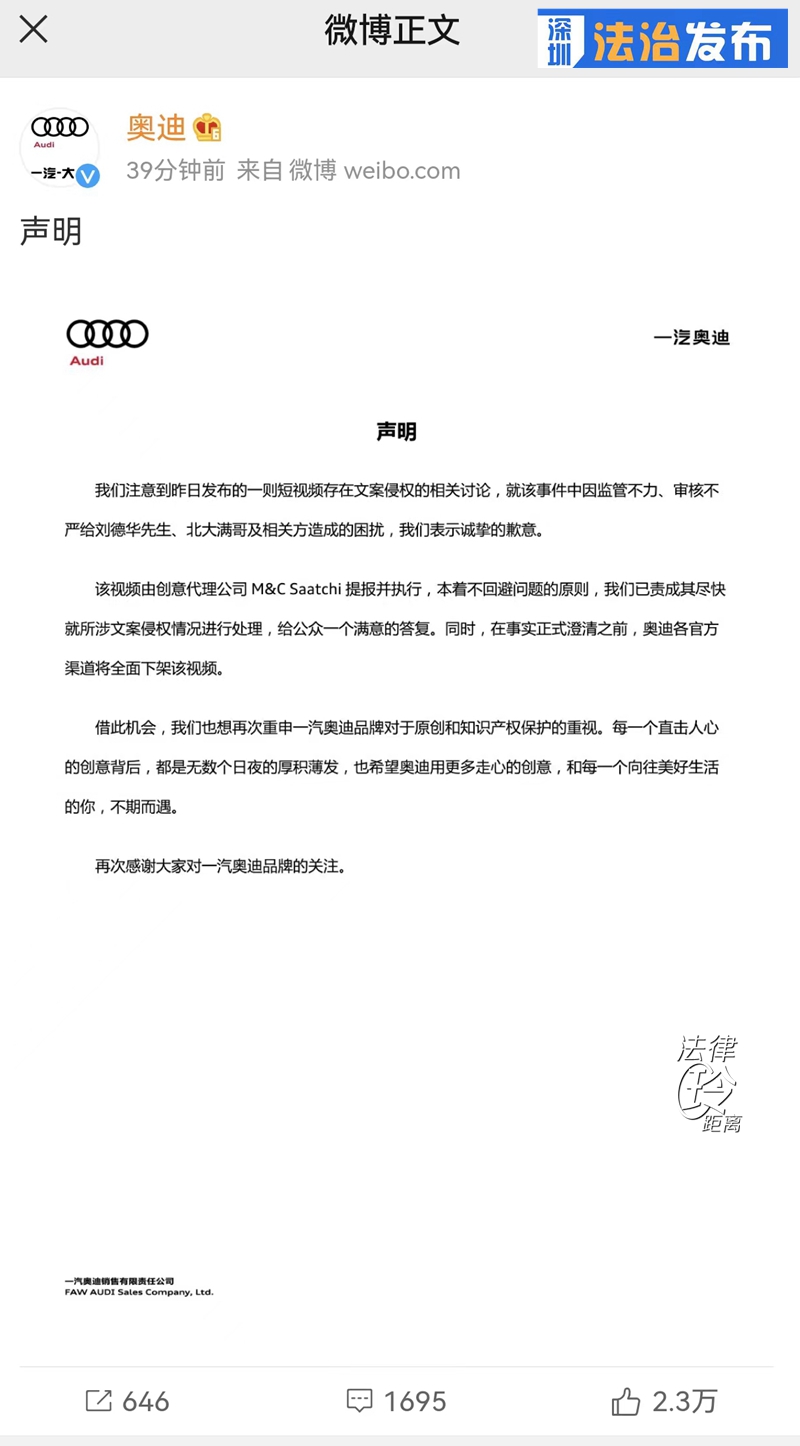 5月22日,奧迪官方全面下架了這部短片,并發(fā)布了道歉聲明。從奧迪公司的回應(yīng)得知,該短片由創(chuàng)意代理公司M&C Saatchi(上思廣告)提報(bào)并執(zhí)行,上思廣告也在微信公眾號(hào)發(fā)布聲明,承認(rèn)團(tuán)隊(duì)在未與版權(quán)方溝通的情況下,直接使用了抖音博主北大滿哥關(guān)于“小滿”的視頻中的文案內(nèi)容。