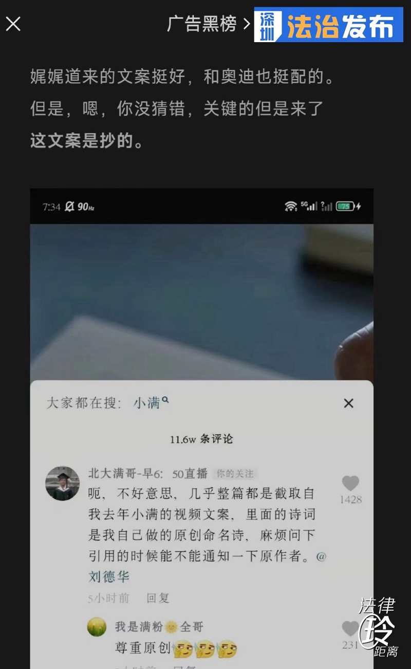 讀特客戶端·深圳新聞網(wǎng)2022年5月24日訊(記者 張玲 翁任瑩 實(shí)習(xí)生 趙薇)5月21日是中國(guó)24節(jié)氣的小滿,奧迪公司一則小滿廣告迅速成為刷屏爆款。在這條名為《今日小滿,人生小滿就好》的廣告短片中,出鏡代言人是劉德華,他用娓娓道來的口吻說著“小滿代表了一種人生態(tài)度……”然而,不到1天的時(shí)間,奧迪小滿廣告就深陷文案抄襲風(fēng)波,博主“北大滿哥”指出這部短片幾乎全文抄了自己去年發(fā)布的小滿視頻文案。