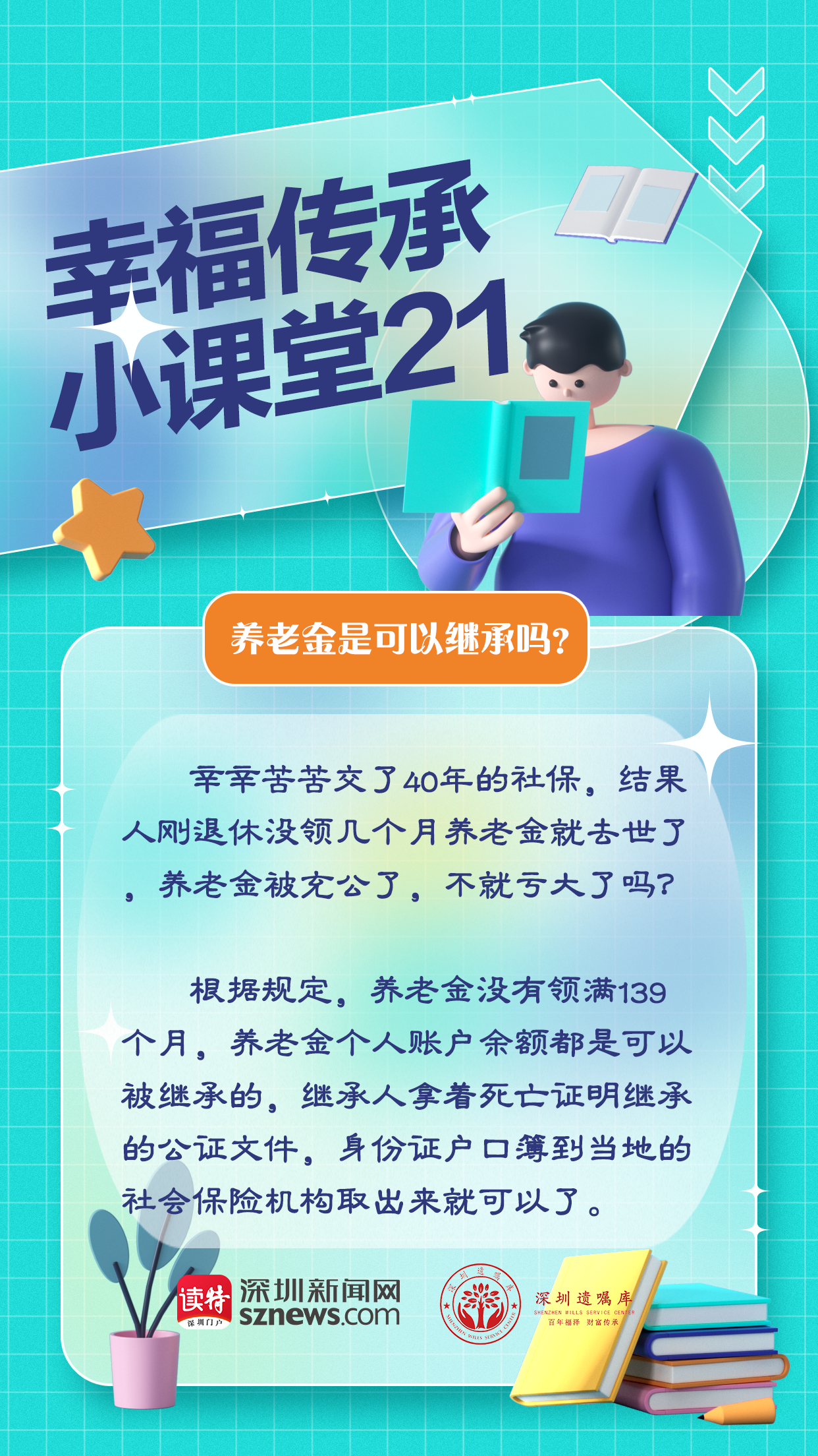 深圳遺囑庫(kù)與深圳新聞網(wǎng)聯(lián)合制作的幸福傳承小課堂第21期,我們來(lái)聊聊養(yǎng)老金繼承問(wèn)題。根據(jù)規(guī)定,養(yǎng)老金沒有領(lǐng)滿139個(gè)月,養(yǎng)老金個(gè)人賬戶余額都是可以被繼承的。繼承人拿著死亡證明繼承的公證文件,身份證戶口簿到當(dāng)?shù)氐纳鐣?huì)保險(xiǎn)機(jī)構(gòu)取出來(lái)就可以了。