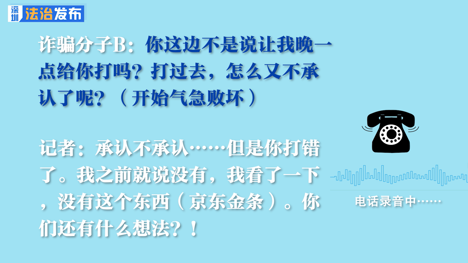 詐騙分子B:你這邊不是說讓我晚一點給你打嗎?打過去,怎么又不承認(rèn)了呢?(開始?xì)饧睌模?/p>