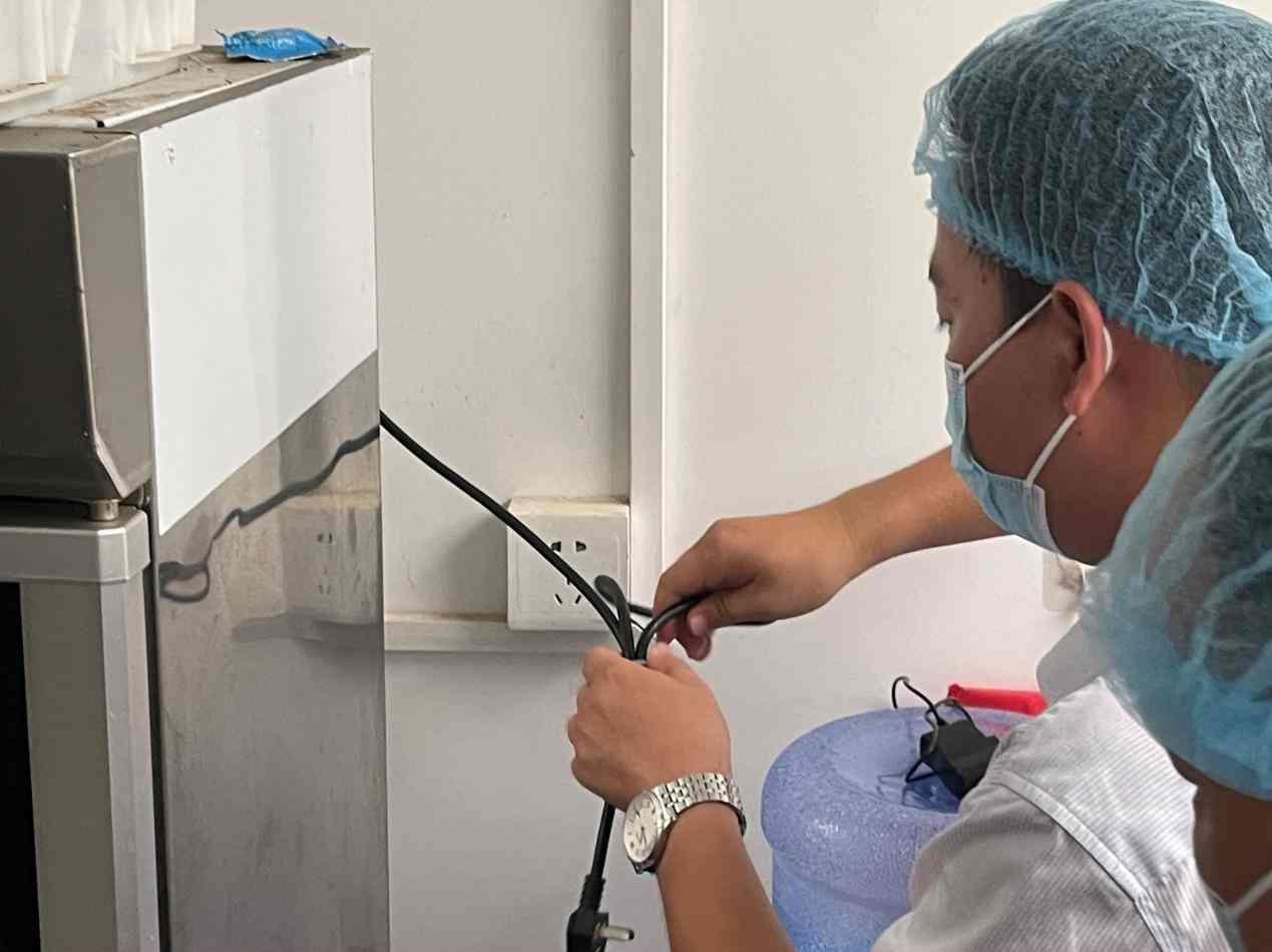 執(zhí)法人員也對后廚的設(shè)施進(jìn)行了細(xì)致檢查。在檢查消毒柜時,執(zhí)法人員發(fā)現(xiàn)該消毒柜未連通電源,對存放在其中的餐具起不到消毒的作用;而在配餐間,存放菜品的保溫池也并未接通電源,執(zhí)法人員稱,若保溫池不接通電源,菜品的中心溫度極有可能無法保持在70°以上,容易滋生細(xì)菌,造成食物中毒。