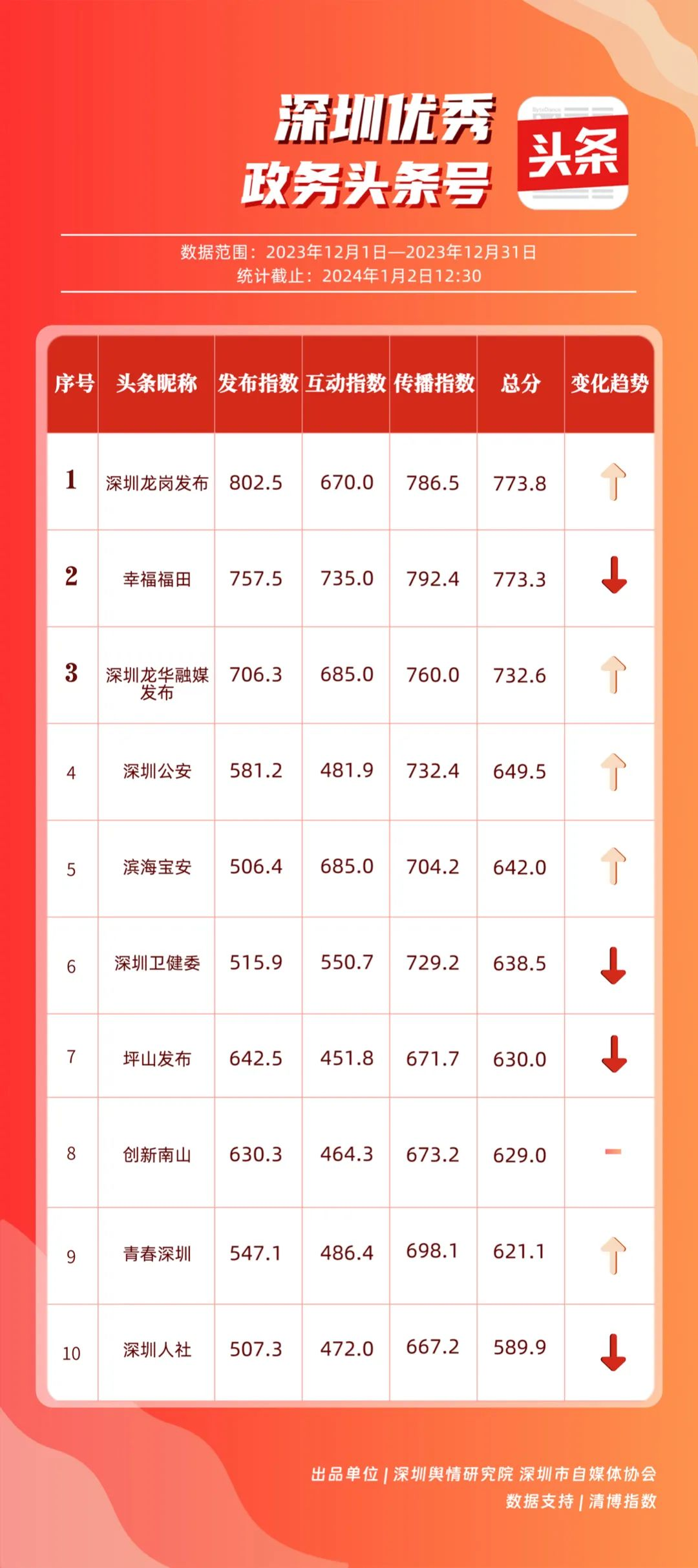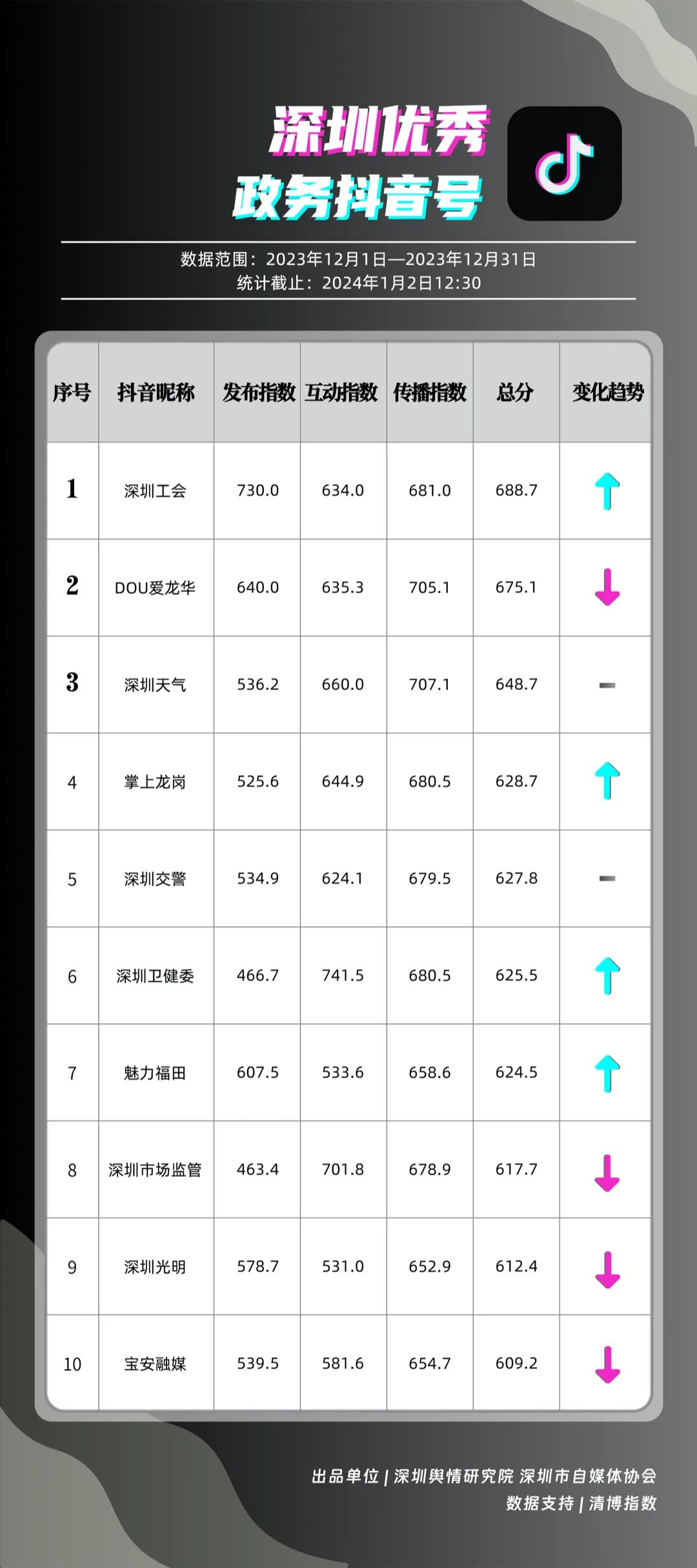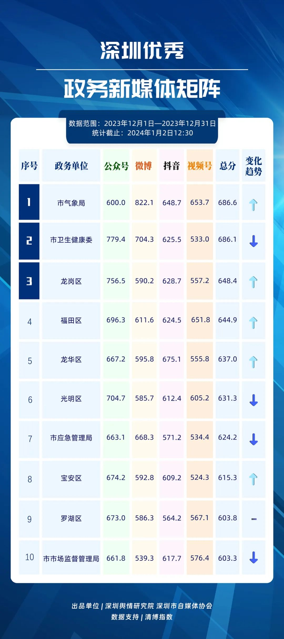 深圳新聞網(wǎng)1月16日訊(記者 陳曉君 實(shí)習(xí)生 張馳)2024年1月15日,《深圳優(yōu)秀政務(wù)新媒體矩陣》(2023年12月期)正式發(fā)布,共有10個(gè)新媒體矩陣被評為“優(yōu)秀”,分別是市氣象局、市衛(wèi)生健康委、龍崗區(qū)、福田區(qū)、龍華區(qū)、光明區(qū)、市應(yīng)急管理局、寶安區(qū)、羅湖區(qū)、市市場監(jiān)督管理局。上述優(yōu)秀矩陣在內(nèi)容質(zhì)量、更新頻率、粉絲互動(dòng)等方面穩(wěn)定性較高,獲得公眾的關(guān)注與支持。