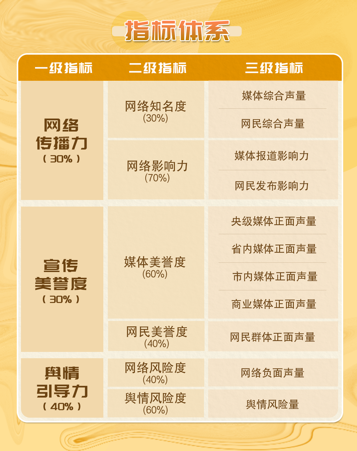 榜單推出后,關注度和討論度持續(xù)提升,為各街道網(wǎng)絡形象建設提供了指南。為了更科學、更全面、更精準地展現(xiàn)深圳各街道在網(wǎng)絡形象建設、正面宣傳引導方面取得的成效,榜單自本期起改版升級,將“傳播力”“引導力”“形象力”三大指標升級整合為“網(wǎng)絡傳播力”“宣傳美譽度”“輿情引導力”指標。深圳輿情研究院還進一步優(yōu)化了榜單指標評價體系,對全市11個區(qū)共78個街道的網(wǎng)絡形象及影響力進行綜合評估。