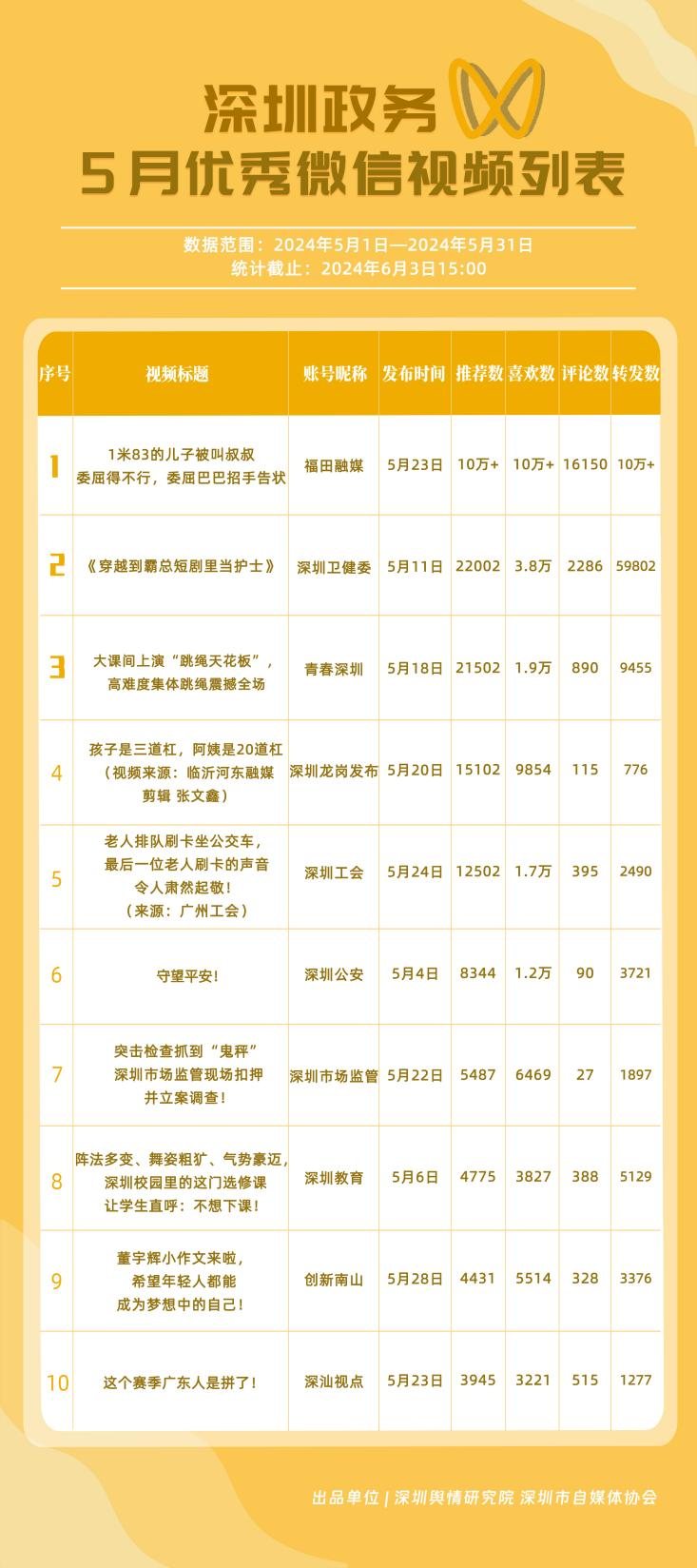 5月,政務微信視頻號“福田融媒”“深圳衛(wèi)健委”“深圳教育”“青春深圳”“深圳天氣”“創(chuàng)新南山”“深汕觀點”“深圳龍崗發(fā)布”“深圳工會”和“深圳市場監(jiān)管”入選“深圳優(yōu)秀政務微信視頻號”,以上上榜單位都能夠在持續(xù)發(fā)揮政務單位主體功能的同時,穩(wěn)定輸出觀眾所需的優(yōu)質(zhì)內(nèi)容。結(jié)合整體數(shù)據(jù)來看,5月深圳政務視頻號平臺內(nèi)容百花齊放,出現(xiàn)多個優(yōu)質(zhì)、熱門作品,如《1米83的兒子被叫叔叔委屈得不行,委屈巴巴招手告狀》《穿越到霸總短劇里當護士》等,是各上榜單位積極探索政務新媒體正能量傳播機制的良好體現(xiàn)。