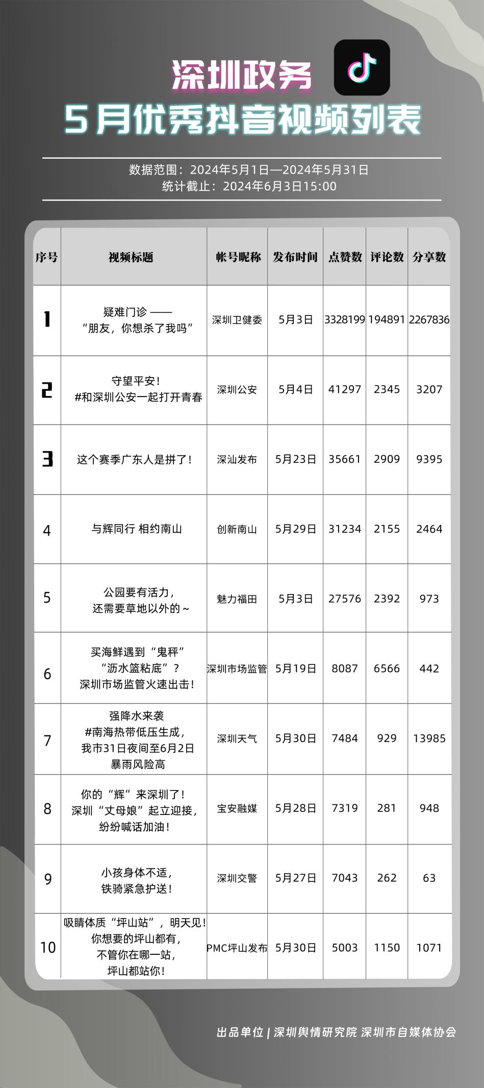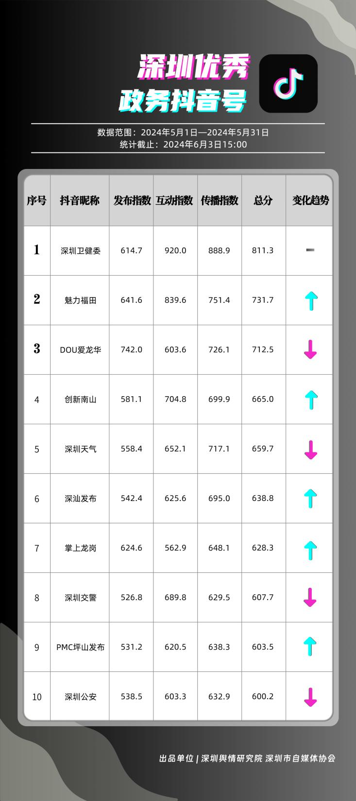 5月,共有10個政務抖音號獲得“深圳優(yōu)秀政務抖音號”稱號,分別是“深圳衛(wèi)健委”“魅力福田”“DOU愛龍華”“創(chuàng)新南山”“深圳天氣”“深汕發(fā)布”“掌上龍崗”“深圳交警”“PMC坪山發(fā)布”和“深圳公安”,多個政務抖音號能夠把握短視頻平臺宣傳要領,持續(xù)發(fā)布優(yōu)質(zhì)信息內(nèi)容,做到了政務便民化、政務信息傳播高效化,為政務信息發(fā)布模式開創(chuàng)新渠道樹立了良好典范。