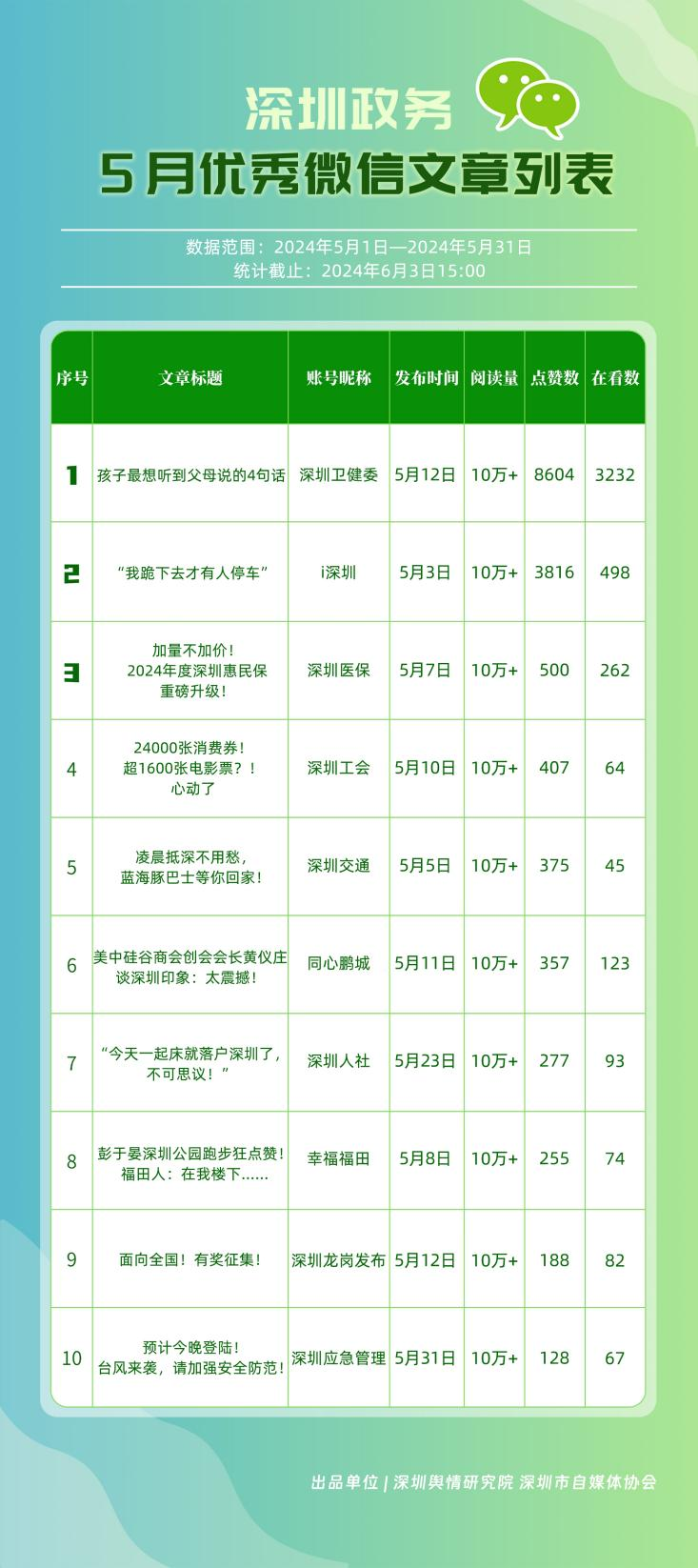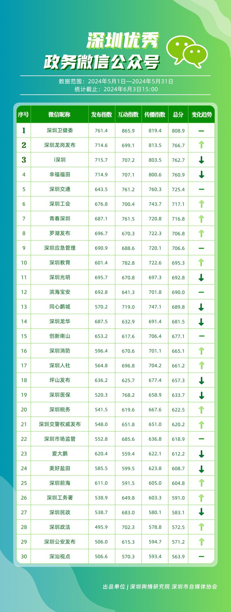 5月,“深圳衛(wèi)健委”“深圳龍崗發(fā)布”“i深圳”“幸福福田”“深圳交通”“深圳工會”“青春深圳”“羅湖發(fā)布”“深圳應急管理”“深圳教育”等30個政務微信公眾號,被評為“深圳優(yōu)秀政務微信公眾號”。5月,“深圳衛(wèi)健委”憑借精心創(chuàng)作的內(nèi)容、與受眾深入互動,多篇作品深受好評,榮登榜單首位?!吧钲邶垗彴l(fā)布”“i深圳”“幸福福田”“深圳交通”等上榜公眾號也積極捕捉觀眾優(yōu)質(zhì)作品需求,把握主流熱點趨勢,集中發(fā)揮政務媒體傳播力量,在本期也取得了較為亮眼的成績,進一步推動了政務信息傳播工作提質(zhì)增效。