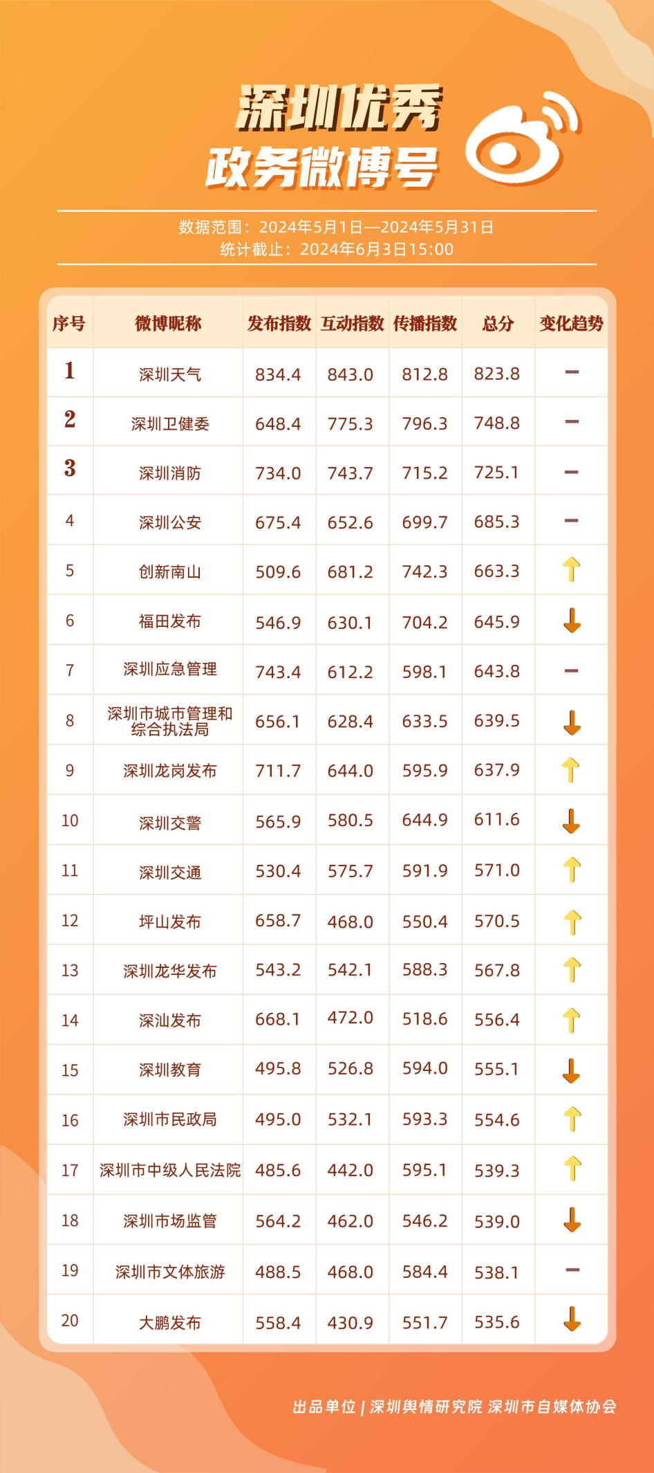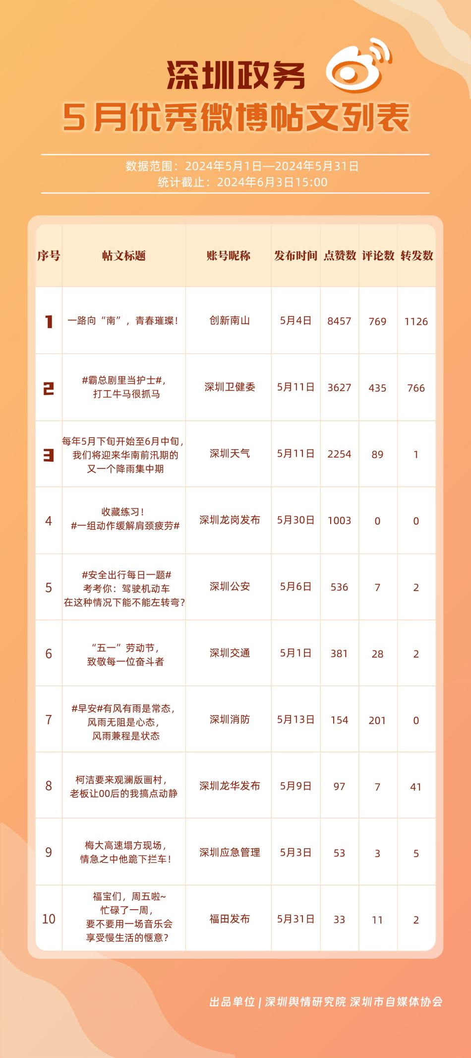 5月,“深圳天氣”“深圳衛(wèi)健委”“深圳消防”“深圳公安”“創(chuàng)新南山”“福田發(fā)布”“深圳應急管理”“深圳市城市管理和綜合執(zhí)法局”“深圳龍崗發(fā)布”“深圳交警”等20個政務微博號入列“優(yōu)秀”名單。對比上期來看,“深圳天氣”“深圳衛(wèi)健委”“深圳消防”“深圳公安”發(fā)揮穩(wěn)定,能夠合理利用微博傳播渠道,持續(xù)輸出受眾喜聞樂見的高質(zhì)量內(nèi)容,“創(chuàng)新南山”“深圳龍崗發(fā)布”等微博號則在5月發(fā)力宣傳,整體傳播效果有所提升,收獲網(wǎng)民好評。