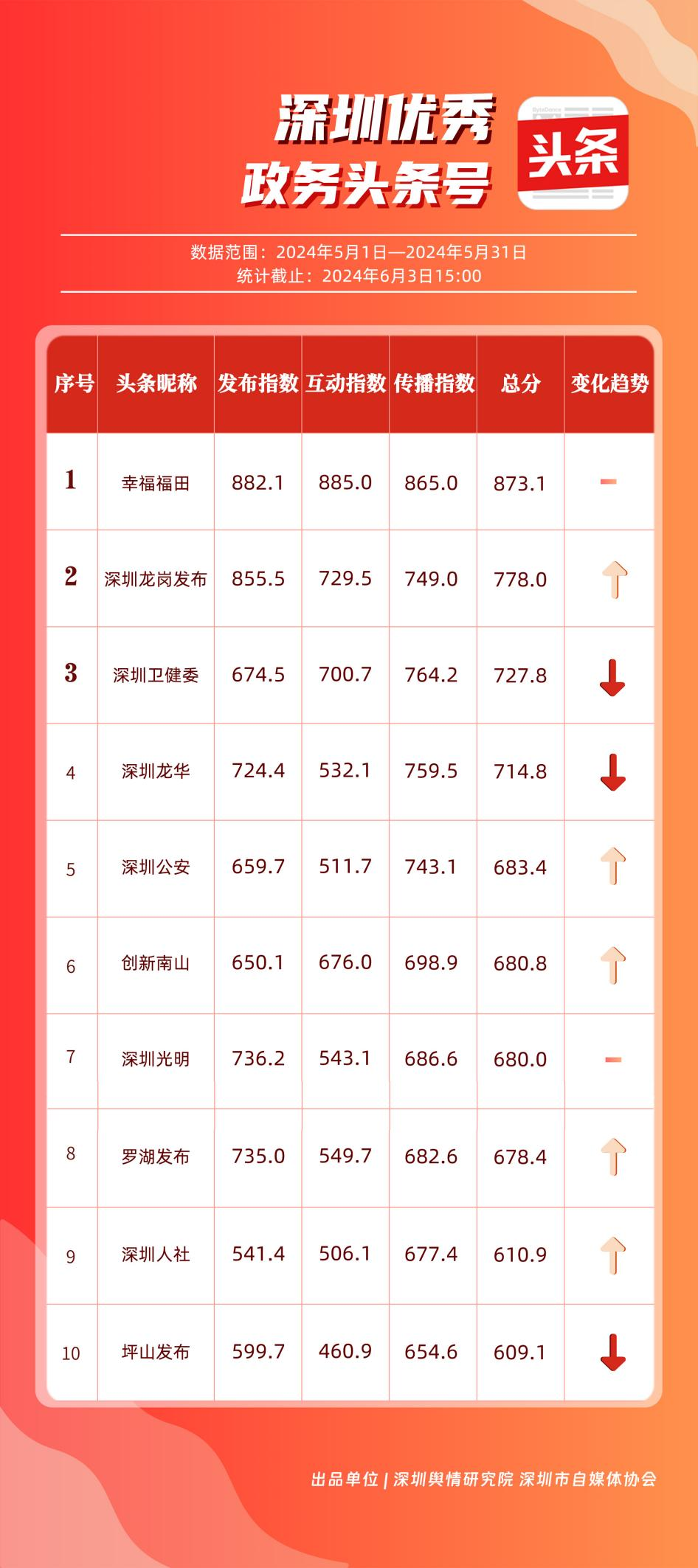 5月,“幸福福田”“深圳龍崗發(fā)布”“深圳衛(wèi)健委”“深圳龍華”“深圳公安”“創(chuàng)新南山”“深圳光明”“羅湖發(fā)布”“深圳人社”“坪山發(fā)布”共10個政務頭條號能夠及時發(fā)布政務信息及公共服務信息,服務經(jīng)濟社會發(fā)展,滿足公眾信息需求,位列“優(yōu)秀政務頭條號”榜單,《廣東人將挑戰(zhàn)暴雨上班30天》《幫朋友問:“口~”會不會傳染艾滋?。俊返葍?yōu)秀文章資訊深入人心。其他未上榜單位應積極運用該新媒體平臺助力政務公開,讓權(quán)威聲音有效傳播到目標受眾,更好地服務人民群眾。