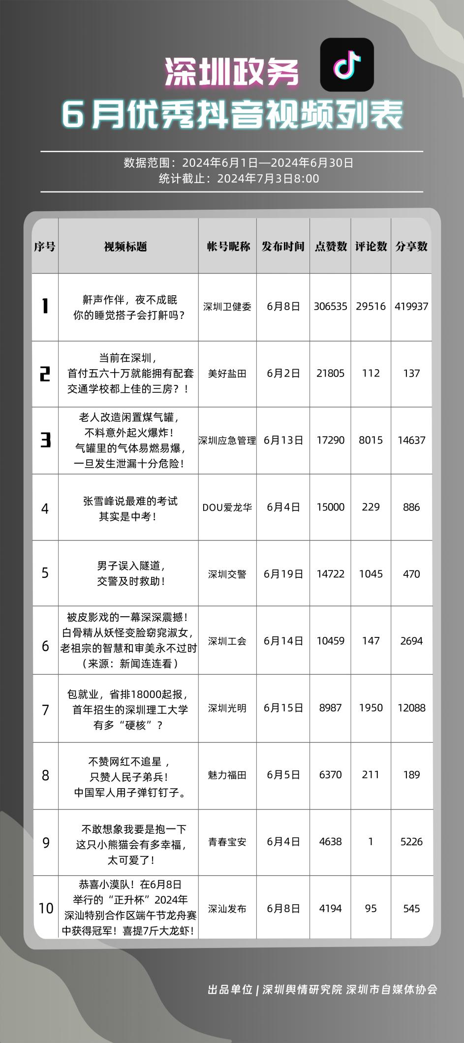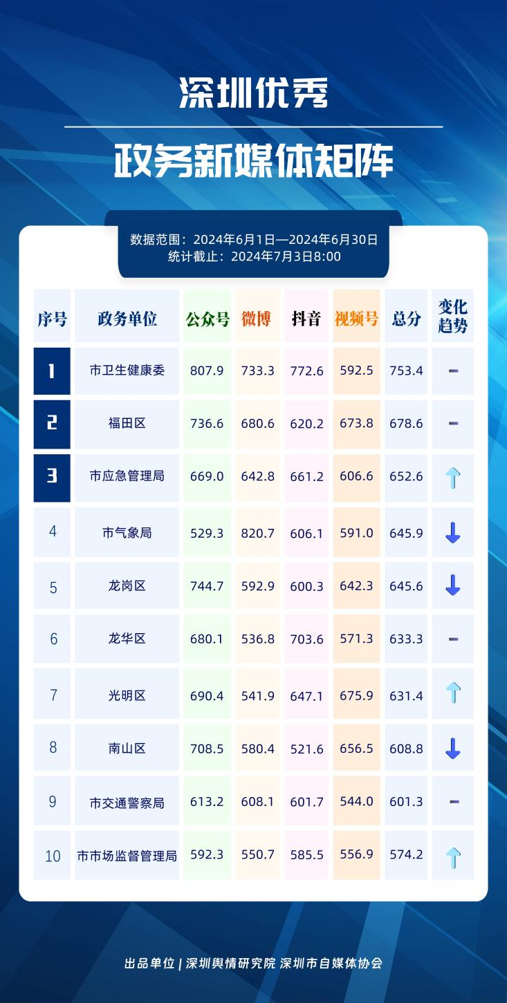 榜單在持續(xù)展示深圳政務(wù)新媒體矩陣建設(shè)成效的同時(shí),梳理總結(jié)了深圳政務(wù)微信公眾號、微信視頻號、微博號、抖音號、頭條號的運(yùn)營方法與經(jīng)驗(yàn),是政務(wù)公開、回應(yīng)群眾關(guān)切的重要載體。6月,又有哪些政務(wù)新媒體取得優(yōu)異成績呢?《深圳優(yōu)秀政務(wù)新媒體矩陣》(2024年6月期)邀您共同關(guān)注。