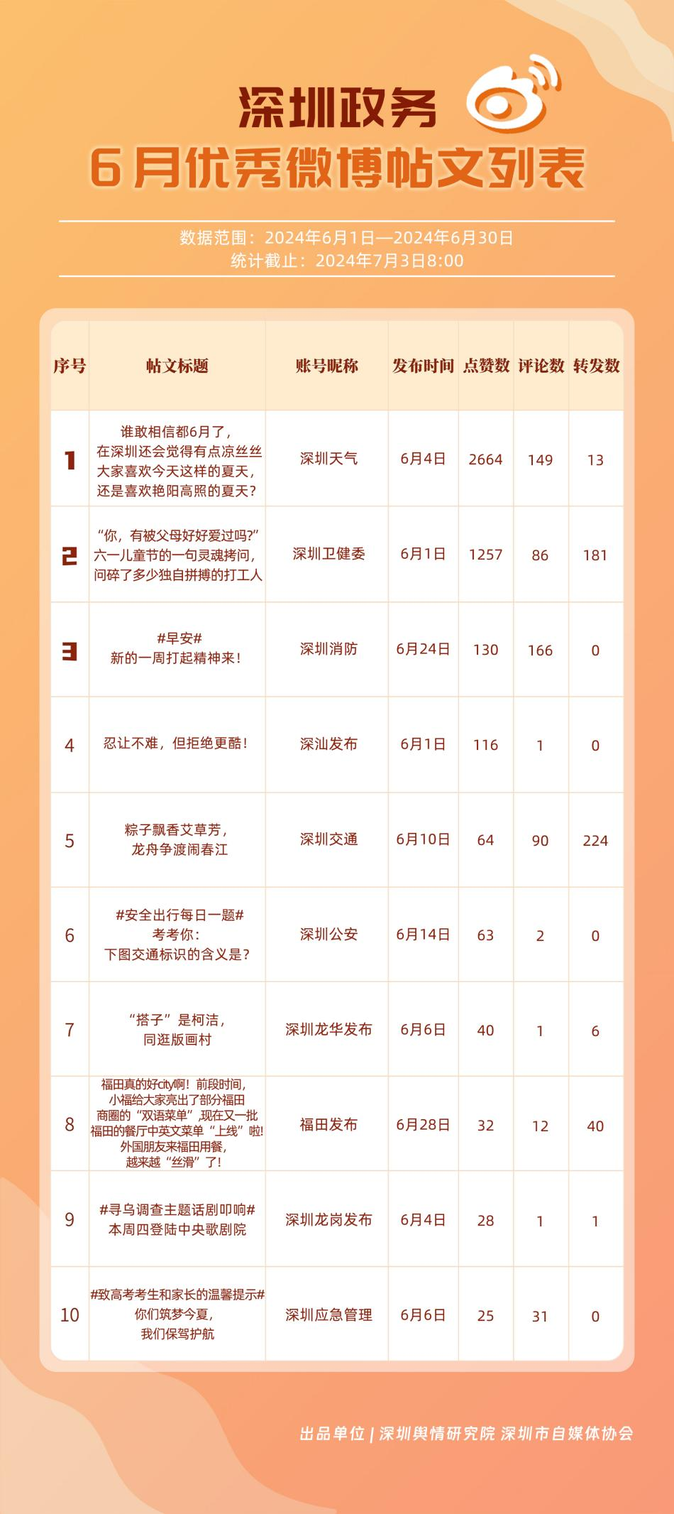 6月,“深圳天氣”“深圳衛(wèi)健委”“深圳消防”“福田發(fā)布”“深圳公安”“深圳應(yīng)急管理”“深圳交通”“深圳市城市管理和綜合執(zhí)法局”“深圳交警”“深圳龍崗發(fā)布”等20個(gè)政務(wù)微博號入列“優(yōu)秀”名單?!吧钲谔鞖狻薄吧钲谛l(wèi)健委”“深圳消防”等賬號抓住微博平臺的傳播特征,持續(xù)輸出優(yōu)質(zhì)內(nèi)容,滿足受眾需求,不斷提高用戶體驗(yàn)和傳播效果。