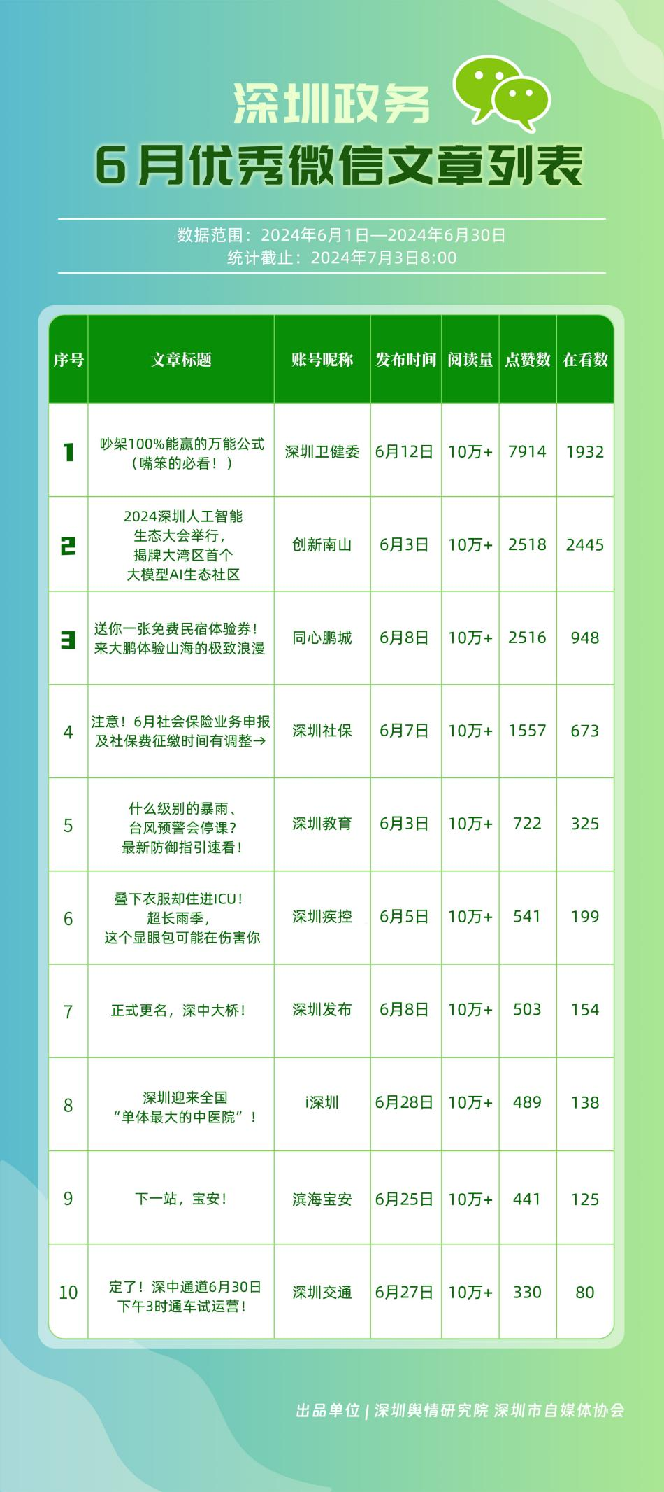 6月,“深圳衛(wèi)健委”“i深圳”“深圳龍崗發(fā)布”“幸福福田”“深圳交通”“深圳教育”“濱海寶安”“創(chuàng)新南山”“深圳工會”“青春深圳”“同心鵬城”“深圳光明”等30個(gè)政務(wù)微信公眾號,被評為“深圳優(yōu)秀政務(wù)微信公眾號”。6月,“深圳衛(wèi)健委”因內(nèi)容策劃出色、受眾互動(dòng)活躍、作品火熱“出圈”等,榮登排行榜首位?!皠?chuàng)新南山”“同心鵬城”“深圳社保”“深圳教育”等上榜公眾號也積極創(chuàng)作優(yōu)質(zhì)作品,抓住時(shí)下熱點(diǎn)趨勢,集中發(fā)揮政務(wù)媒體傳播力量,推動(dòng)了政務(wù)信息傳播工作提質(zhì)增效。