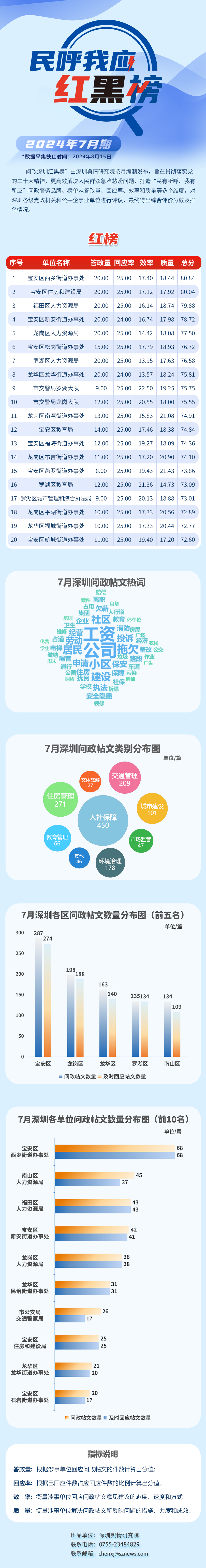 “深圳民呼我應(yīng)紅黑榜”由深圳輿情研究院按月編制發(fā)布,旨在貫徹落實(shí)黨的二十大精神,更高效解決人民群眾急難愁盼問(wèn)題,打造“民有所呼、我有所應(yīng)”問(wèn)政服務(wù)品牌。榜單從答政量、回應(yīng)率、效率和質(zhì)量等多個(gè)維度對(duì)深圳各級(jí)黨政機(jī)關(guān)和公共企事業(yè)單位進(jìn)行評(píng)議,最終得出綜合評(píng)價(jià)分?jǐn)?shù)及排名情況。