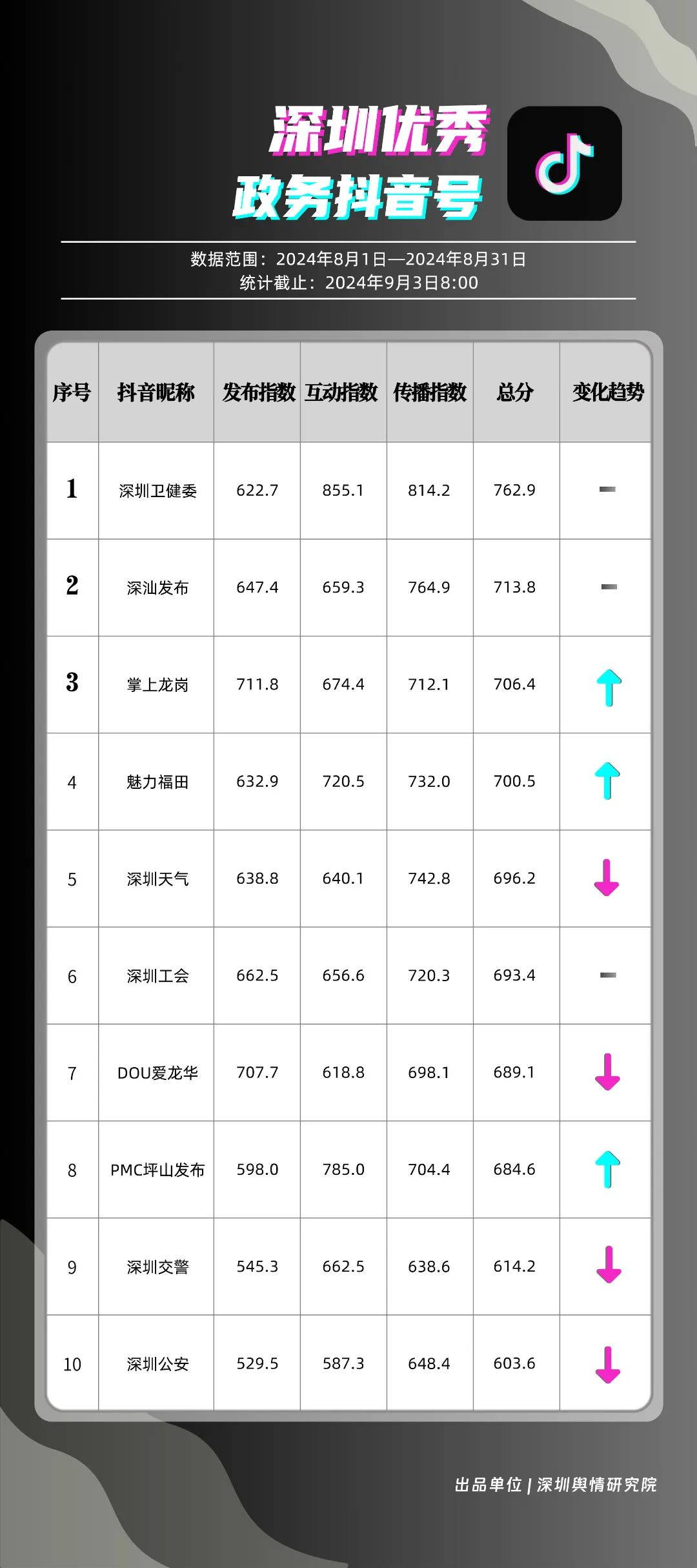 8月,“深圳衛(wèi)健委”“深汕發(fā)布”“掌上龍崗”“魅力福田”“深圳天氣”“深圳工會”“DOU愛龍華”“PMC坪山發(fā)布”“深圳交警”和“深圳公安”共10個政務抖音號獲得優(yōu)秀稱號,“深圳衛(wèi)健委”“深汕發(fā)布”“掌上龍崗”以高分居榜單前三,賬號有關“醫(yī)師節(jié)”“猴痘”“奧運金牌”的視頻獲得了較高的關注度和討論度,相關優(yōu)秀視頻在傳播信息的同時,也展現(xiàn)了深圳政務抖音號在內容質量、互動性和傳播度方面的實力。