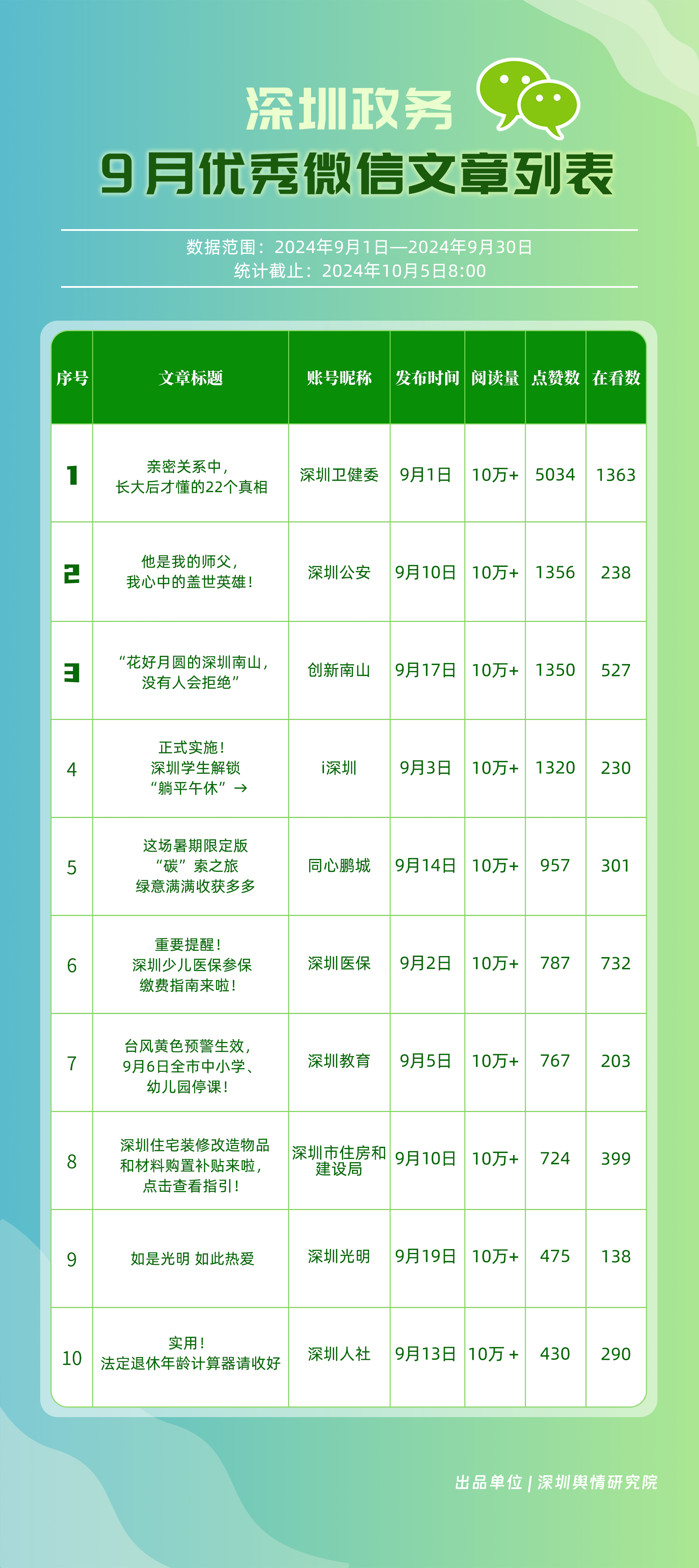 9月,“幸福福田”“深圳龍崗發(fā)布”“創(chuàng)新南山”“深圳龍華”“羅湖發(fā)布”“深圳光明”“青春深圳”“深圳衛(wèi)健委”“濱海寶安”和“深圳公安”共10個政務頭條號入選“優(yōu)秀政務頭條號”榜單。文章《剛剛!20多分鐘警報響徹深圳,不少人瞬間淚目……》涉及重大歷史節(jié)點,引發(fā)市民深刻共鳴,《耳朵總是癢癢癢,是怎么回事?》《強冷空氣即將抵達廣東!國慶出游天氣……》等深入民生領域、緊貼節(jié)假日需求,提供了健康知識科普和氣象信息,以高度實用價值獲得網(wǎng)民點贊。