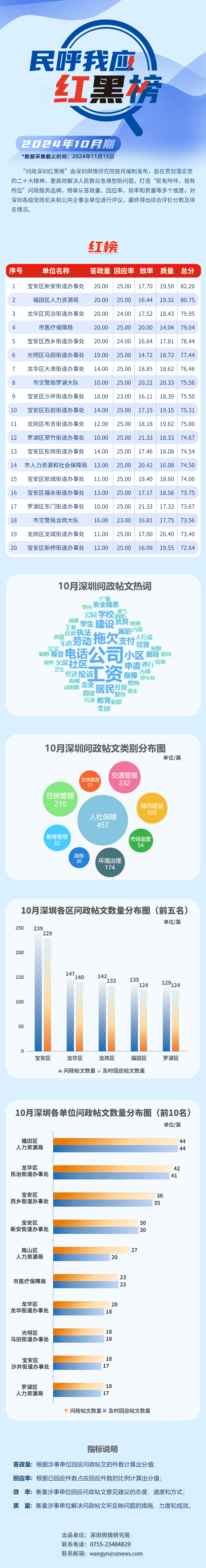 “深圳民呼我應(yīng)紅黑榜”由深圳輿情研究院按月編制發(fā)布,旨在貫徹落實黨的二十大精神,更高效解決人民群眾急難愁盼問題,打造“民有所呼、我有所應(yīng)”問政服務(wù)品牌。榜單從答政量、回應(yīng)率、效率和質(zhì)量等多個維度對深圳各級黨政機關(guān)和公共企事業(yè)單位進行評議,最終得出綜合評價分數(shù)及排名情況。