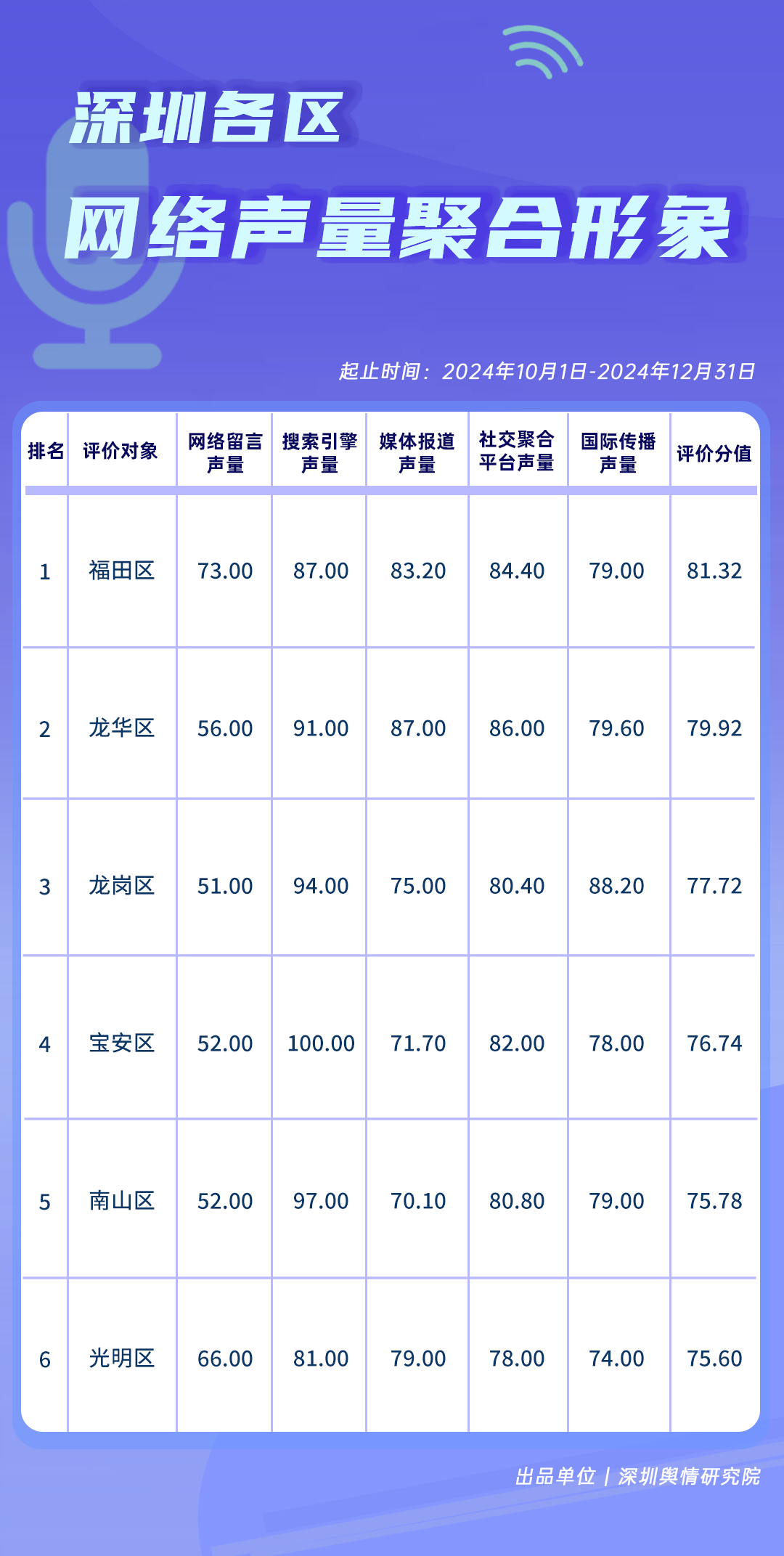 網(wǎng)絡(luò)輿情方面,羅湖區(qū)、光明區(qū)、龍崗區(qū)得分在80分以上,登上《深圳各區(qū)網(wǎng)絡(luò)輿情形象榜》前三名,福田區(qū)、龍華區(qū)、坪山區(qū)以超過75分的綜合評價(jià)分值上榜,體現(xiàn)出各區(qū)在維護(hù)良好網(wǎng)絡(luò)輿情生態(tài)、快速響應(yīng)網(wǎng)民關(guān)切等方面的積極態(tài)度。