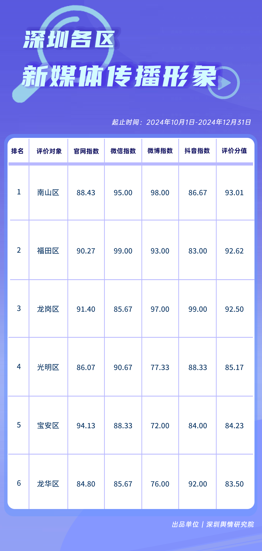 10-12月,福田區(qū)、龍崗區(qū)、光明區(qū)、龍華區(qū)、南山區(qū)、寶安區(qū)登上榜單前六。榜單中,福田區(qū)、龍崗區(qū)、光明區(qū)位列前三,綜合評價(jià)分值均在80分以上,居于榜單第四至第六名的龍華區(qū)、南山區(qū)、寶安區(qū)也在積極塑造網(wǎng)絡(luò)形象的道路上不斷邁進(jìn),展現(xiàn)了各區(qū)在網(wǎng)絡(luò)形象建設(shè)領(lǐng)域的蓬勃活力與持續(xù)努力。